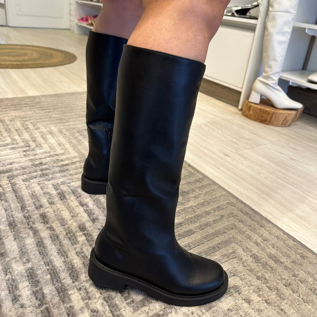 Bota preta Leona em couro sintético . O modelo tem cano longo, bico redondo e salto baixo emborrachado e tratorado. zíper na lateral, facilitando o calce.
