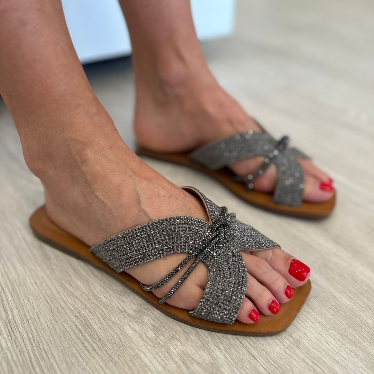 Rasteira Miranda tem bico quadrado e solado flat.Traz tiras sobre o peito do pé com aplicações em strass grafite.