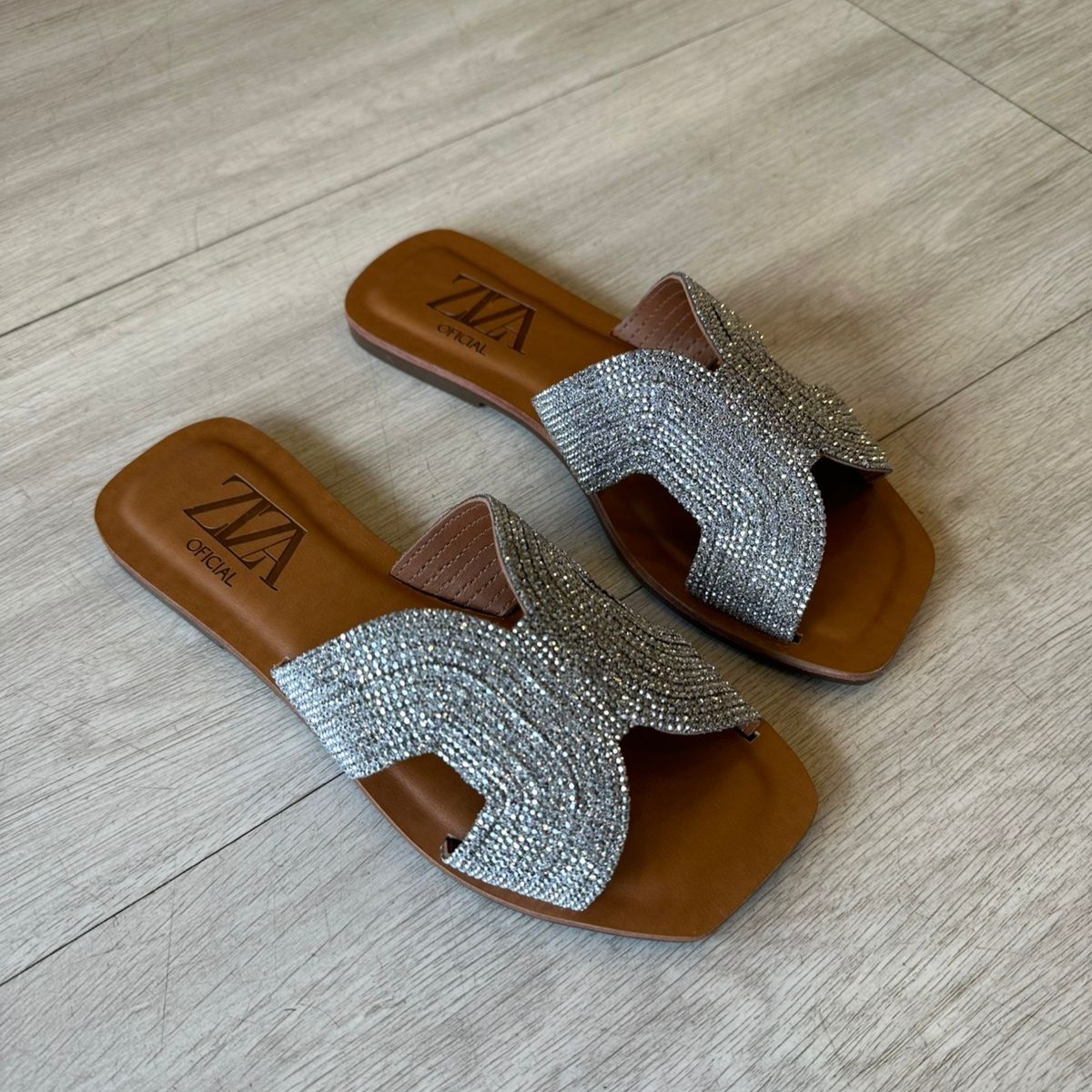 Rasteira Sheyla tem bico quadrado e solado flat.Traz tiras sobre o peito do pé com aplicações em cristais prata, aberta atrás com solado emborrachado.