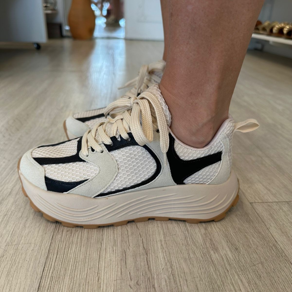 O tênis Hailey tem o material em tela off white, recortes em courino preto e em nobuck off white, amarração com cadarço e solado emborrachado 5cm.